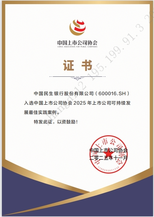 近日,中國上市公司協會發布《2025中國上市公司可持續發展最佳實踐案例》,民生銀行從5000余家上市公司中脫穎而出,榮獲“2025年上市公司可持續發展最佳實踐案例”,這是民生銀行連續第三年入選,體現出行業協會對民生銀行可持續發展工作質效的高度認可。
